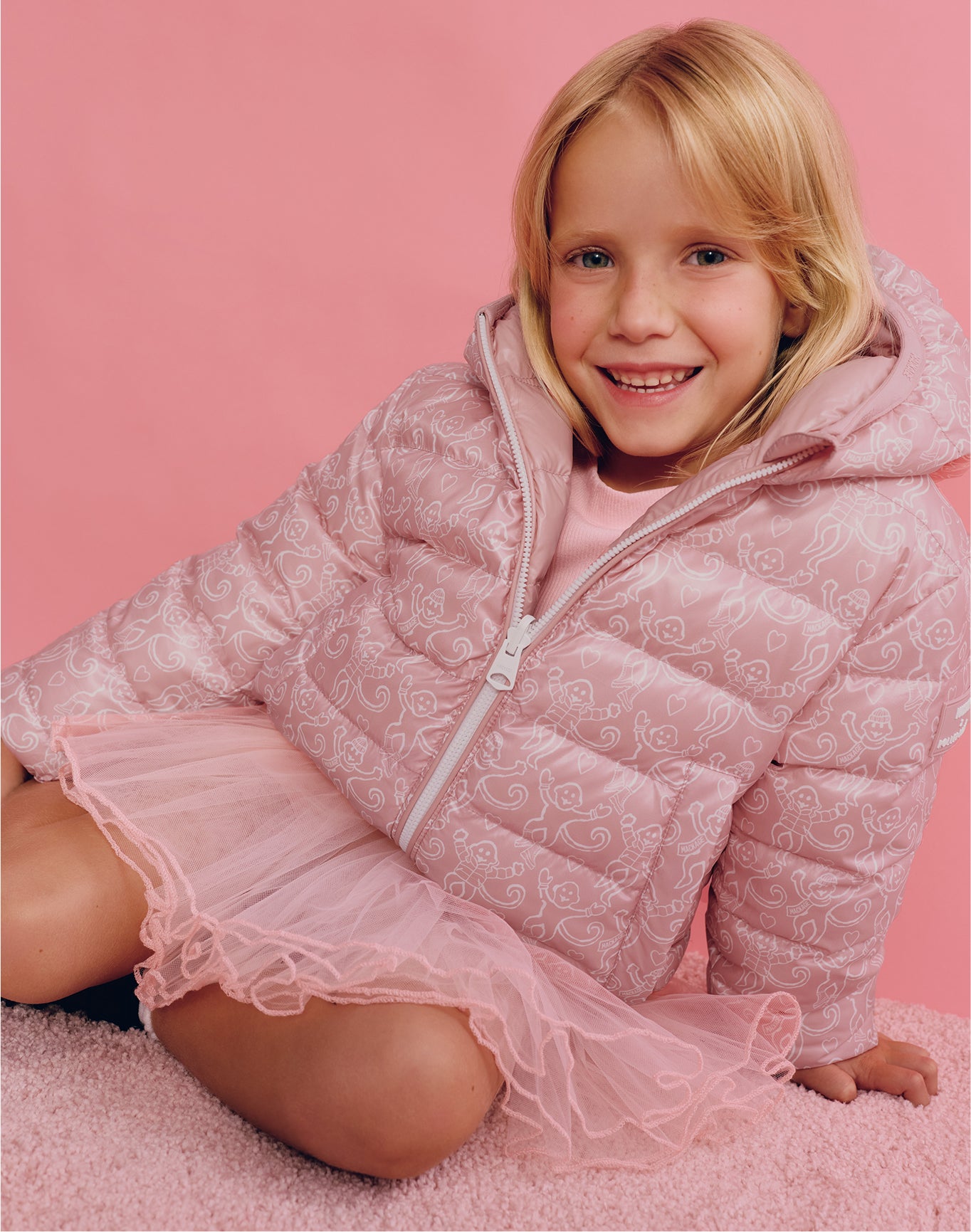 The 23-piece collection introduces three exclusive prints — Quilted Hearts, MACKAGE Monkey in Black and Pink — reimagined across reversible jackets, puffers, accessories, and the debut of MACKAGE loungewear.