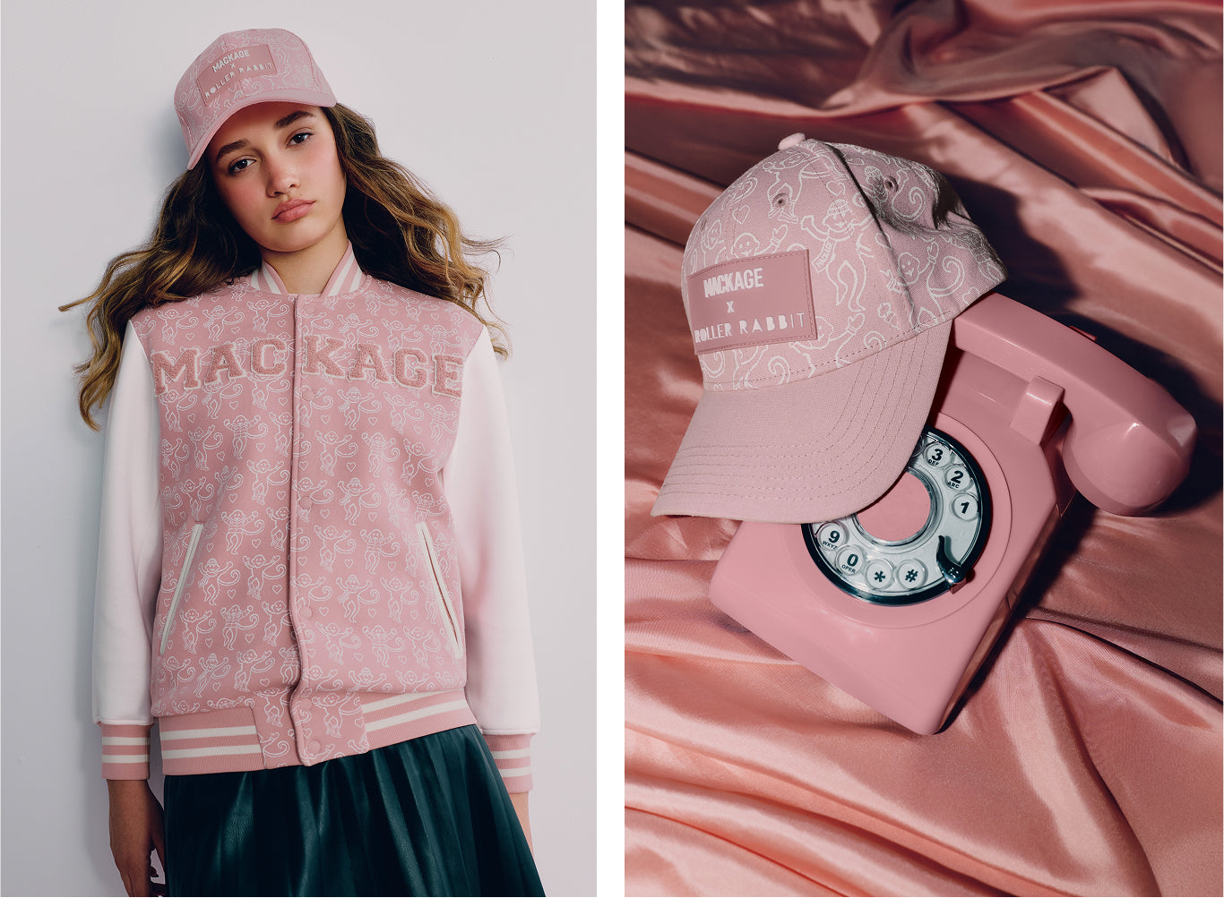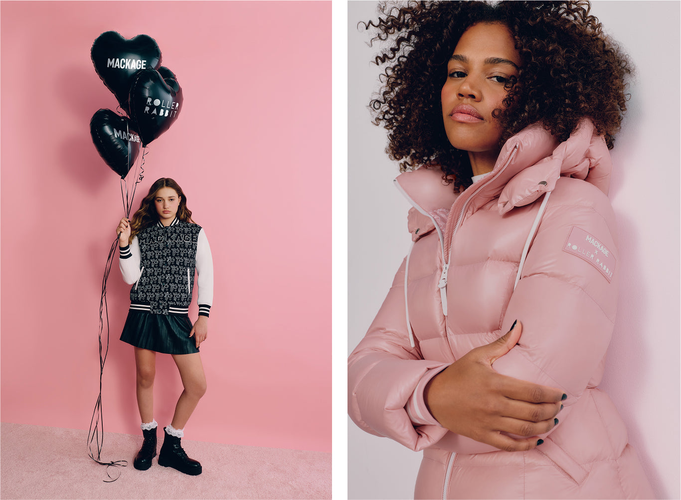 The 23-piece collection introduces three exclusive prints — Quilted Hearts, MACKAGE Monkey in Black and Pink — reimagined across reversible jackets, puffers, accessories, and the debut of MACKAGE loungewear.